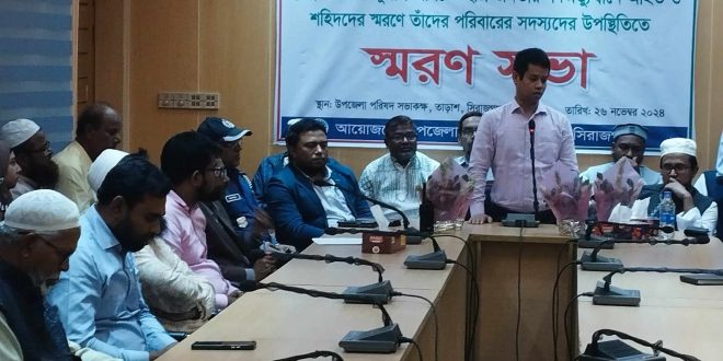সাব্বির আহম্মেদঃ সিরাজগঞ্জের তড়াশে ছাত্র-জনতার গনঅদ্ভুত্থানে আহতদের সুস্থতা কামনা ও শহীদদের স্মরণে পরিবারের সদস্যদের উপস্থিতিতে স্মরণসভা অনুষ্ঠিত হয়েছ। বুধবার সকালে উপজেলা পরিষদ সভা কক্ষে উপজেলা প্রশাসনের আয়াজনে ওই স্মরণসভা অনুষ্ঠিত হয়। এতে সভাপতিত্ব করেন উপজেলা নির্বাহী কর্মকর্তা সুইচিং মং মারমা। উক্ত সভায় ঢাকাতে আহত তাড়াশের চার কৃতি সন্তানকে সংবর্ধনা দেয়া হয়। ওই চার কৃতি সন্তান হলেন আহত জাহাঙ্গীর আলম, মহিউদ্দিন, জাকারিয়া হোসেন ও হাসিবুর রহমান। উক্ত স্মরণ সভায় বক্তব্য রাখেন, তাড়াশ উপজেলা বিএনপির সাধারণ সম্পাদক অধ্যাপক আমিনুর রহমান টুটুল, তাড়াশ প্রেসক্লাবের সভাপতি অধ্যাপক সাব্বির আহমেদ, বাংলাদেশ জামাতে ইসলামী তাড়াশ উপজেলা শাখার সাধারণ সম্পাদক শাজাহান আলী, ইসলামী শাসনতন্ত্র আন্দোলন তাড়াশ উপজেলা শাখার সাংগঠনিক সম্পাদক এইচ এম মাহবুবুর রহমান, উপজেলা মৎস্য কর্মকর্তা মশগুল আজাদ, উপজেলা কৃষি কর্মকর্তা আব্দুল্রাহ আল মামুন. ছাত্র প্রতিনিধি নিরব,সাব্বির প্রমুখ। এ সময় বক্তাগণ ছাত্র-জনতার গনঅদ্ভুত্থানে আহতদের প্রতি কৃতজ্ঞতা এবং শহীদদের অবদানের কথা বিশেষ ভাবে স্মরণ করেন।
