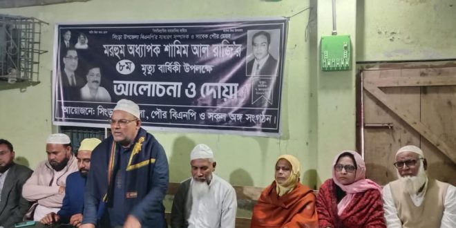 সিংড়া(নাটোর) প্রতিনিধিঃ নাটোরের সিংড়ায় উপজেলা বিএনপির সাবেক সাধারণ সম্পাদক ও পৌর মেয়র, অধ্যাপক শামিম আল রাজি’র ৮ম মৃত্যু বার্ষিকী উপলক্ষে আলোচনা ও দোয়া অনুষ্ঠিত হয়েছে। সিংড়া উপজেলা ও পৌর বিএনপির আয়োজনে মঙ্গলবার বিকেলে উপজেলা বিএনপির কার্যালয়ে সিংড়া পৌর বিএনপির সদস্য সচিব তায়জুল ইসলাম এর সভাপতিত্বে আলোচনা সভা ও দোয়া মাহফিলে উপস্থিত ছিলেন