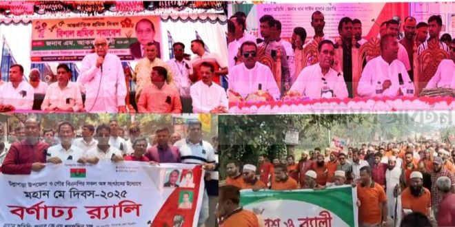 অনুষ্ঠানে আরো উপস্থিত ও বক্তব্য রাখেন সাবেক পৌর মেয়র বিএনপির সিনিয়র নেতা এম বেলাল হোসেন , সাবেক সিনিয়র যুগ্ম আহবায়ক হেলাল সরকার , বিএনপির সিনিয়র নেতা আঃ রাজ্জাক সণ্টু , জাহিদুল ইসলাম , শফিউল মোমেন শফি , মুকুল হোসেন , আশরাফুল আলম মিণ্টু , শাহাদত হোসেন প্রমুখ।এদিকে ইমারত নির্মাণ শ্রমিক ইউনিয়নের উদ্যোগে পৌর মুক্ত মঞ্চে পহেলা মে আন্তর্জাতিক শ্রমিক দিবস উপলক্ষে সমাবেশ অনুষ্ঠান হয়েছে। এতে সভাপতিত্ব করেন সংগঠনের সভাপতি নুরুল ইসলাম নুরু।প্রধান অতিথি হয়ে উপস্থিত ছিলেন পুলিশের সাবেক ডিআইজি খান সাঈদ হাসান। উপজেলা ও পৌর বিএনপির আয়োজনে পৌর বিএনপির সাবেক আহবায়ক মো . আব্দুর রাজ্জাকের সভাপতিত্বে সভা ও র্যালীতে প্রধান অতিথি হয়ে উপস্থিত ছিলেন বিএনপি নেতা মো. শরফুূদ্দিন মঞ্জু।এছাড়া শহরে জামায়াত ইসলামীর শ্রমিক কল্যাণ ফেডারেশনের উদ্যোগে সমাবেশ ও র্যালী অনুষ্ঠান হয়েছে