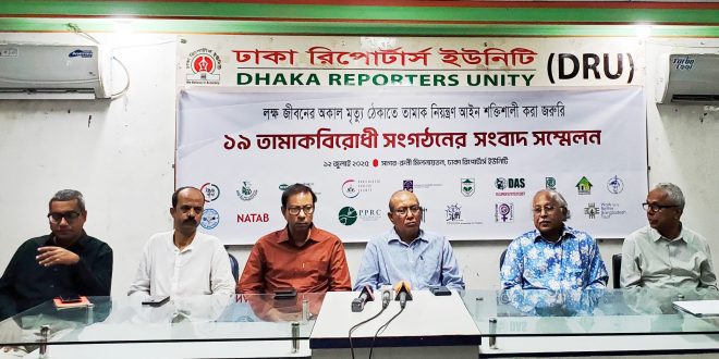 দেশে তামাক ব্যবহারের কারণে বছরে ১ লক্ষ ৬১ হাজার মানুষ মৃত্যুবরণ করে। এই অকাল মৃত্যু ঠেকাতে দ্রুত তামাক নিয়ন্ত্রণ আইনের সংস্কার জরুরি বলে জানিয়েছেন ১৯ তামাকবিরোধী সংগঠনের নেতৃবৃন্দ। আজ শনিবার (১২ জুলাই) ঢাকা রিপোর্টার্স ইউনিটির সাগর-রুনী মিলনায়তনে আয়োজিত সংবাদ সম্মেলনে বক্তারা এই মতামত জানান।