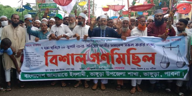 সোমবার (১৪ জুলাই) সন্ধ্যায় উপজেলা জামায়াতে ইসলামী আয়োজিত সমাবেশে প্রধান অতিথির বক্তব্যে তিনি এসব কথা বলেন। এর আগে বিকেলে সাড়ে ৫ টার দিকে ভাঙ্গুড়া বাসস্ট্যান্ড এলাকা থেকে একটি গণমিছিল শহরের প্রধান প্রধান সড়ক প্রদক্ষিণ করে । বৃষ্টি উপেক্ষা করে হাজার হাজার নেতাকর্মী ও সমর্থকরা মিছিলে অংশ গ্রহণ করেন