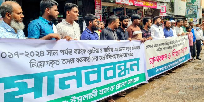গুরুদাসপুরে ইসলামী ব্যাংকসহ ব্যাংক সেক্টরে লুটপাট ও মাফিয়া এস আলম কর্তৃক অবৈধভাবে নিয়োগকৃত অদক্ষ কর্মকর্তা-কর্মচারী ছাটাইয়ের দাবিতে মানবববন্ধন অনুষ্ঠিত হয়েছে।