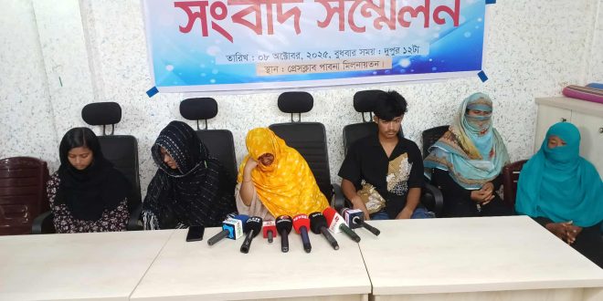 পাবনায় স্বামী হত্যার বিচার চেয়ে সংবাদ সম্মেলন করেছে নিহত স্বপনের স্ত্রী মায়া খাতুন ও তার পরিবার। গতকাল বুধবার বিকেলে প্রেসক্লাব পাবনা মিলনায়তনে এ সংবাদ সম্মেলন অনুষ্ঠিত হয়। সংবাদ সম্মেলনে নিহত স্বপনের স্ত্রী মায়া খাতুন বলেন, ৩ সন্তানের জনক আমার স্বামী স্বপন প্রাং এর সাথে সাঁথিয়া ক্ষেতুপাড়ার সামান্য পাড়ার প্রবাসী মোঃ আরিফের স্ত্রী রতœা খাতুনের সাথে গত ৩-৪ বছর পুর্বে পরকীয়া প্রেমের সর্ম্পক্য গড়ে ওঠে। নিহত স্বপন প্রাং মাঝে মধ্যেই রতœা খাতুনের বাড়িতে যাওয়া আসা করতো। রতœা খাতুনের চাহিদা পুরন করতে গিয়ে আমার সংসারের সকল দামি জিনিসপত্র বিক্রি করে পরকিয়া প্রেমিকা রতœাকে দিয়ে আসতো। রতœার দাবি পুরন করতে গিয়ে আমার সংসার ধ্বংস করে ফেলেছে আমার স্বামী । আমি আমার স্বামীকে তার ৩ সন্তানের ভবিষ্যত নিয়ে অনেক বুঝিয়েছি। এক পর্যায়ে গত ২/৩ মাস আমার স্বামী স্বপন প্রাং,রতœা খাতুনের বাড়িতে যাওয়া-আসা বাদ দিয়েছিল। এ কারনে রতœা আমাকে হুমকি দিয়েছিল তোর সংসার ও স্বামীকে কিভাবে ধ্বংস করতে হয় সে কৌশল আমার জানা আছে। এরপর গত শনিবার সকালে আমার স্বামী নিহত স্বপন প্রাং কাজের উদ্দ্যেশে বাড়ি থেকে বের হয়ে যায়। ২দিন খোঁজ না পাওয়ায় গত সোমবার বিকালে পরকিয়া প্রেমিকা রতœা খাতুন আমাকে ফোন করে বলে, স্বপন অসুস্থ্য আপনি দ্রæত আমাদের বাড়িতে চলে আসেন। এরপর পথিমধ্যে জানতে পারি আমার স্বামীর লাশ সাঁথিয়া থানায় রয়েছে। আমি ও আমার পরিবারের লোকজন সাঁথিয়া থানায় গিয়ে আমার স্বামীর মৃতদেহ সনাক্ত করি। আমার স্বামী স্বপনের হাতের রগ কাটা ছিল। তার দেহে অনেক যায়গায় ফোলা জখম ছিল। লাশের গোসল করানোর সময় দেখতে পাই আমার স্বামীর ঘাড় মটকানো ছিল। মৃত মানুষের ঘাড় যেখানে শক্ত থাকে, সেখানে আমার স্বামীর ঘাড় এদিকে-সেদিক ঘোড়ানো যাচ্ছিল। তাতে আমার সন্দেহ হচ্ছে, আমার স্বামী স্বপনকে শরীরে স্পর্শ কাতর যায়গায় আঘাত করার পর হাতের রগ কেটে ও ঘাড় মটকিয়ে হত্যা করা হয়েছে। এদিকে সাঁথিয়া থানা পুলিশের ভুমিকা রহস্যজনক। আমি মামলা করতে চাইলে তারা একটি কাগজে স্বাক্ষর নিয়ে আমাকে বিদায় করে দেয়। আমি যখন মামলা করার কথা বলি তখন থানা পুলিশ আমাকে জানায়, অপমৃত্যুর মামলা হয়েছে। পোষ্ট মোর্টেম রির্পোট আসার পর পরবর্তি ব্যবস্থা গ্রহন করা হবে। যেখানে একজন মানুষকে পরিকল্পিতভাবে হত্যা করা হয়েছে, পুলিশ সেখানে হত্যা মামলা না নিয়ে, অপমৃত্যুর মামলা দায়ের করেছে। এতে আমি নিশ্চিত পুলিশ আসামীদেরকে রক্ষা করতে কৌশল অবলম্বন করছে। আমি আপনাদের মাধ্যমে আমার স্বামী হত্যার বিচারের জন্য প্রশাসনের কাছে জোরদাবি করছি। আমি আমার স্বামী হত্যার বিচার চাই। সেই সাথে হত্যাকারীদের বিরুদ্ধে হত্যা মামলা গ