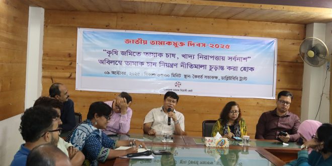 সারাদেশে তামাক কোম্পানির আগ্রাসী প্ররোচনায় তামাক চাষ বৃদ্ধি পাওয়ায় একদিকে কৃষিজমির উর্বরতা নষ্ট হচ্ছে অন্যদিকে খাদ্য নিরাপত্তা হুমকির মুখে পড়ছে। তামাক চাষ নিয়ন্ত্রণে কৃষি মন্ত্রণালয়ের নিরব ভূমিকা সরকারের তামাক নিয়ন্ত্রণ প্রচেষ্টাকে প্রশ্নবিদ্ধ করছে। আজ ০৯ অক্টোবর ২০২৫, জাতীয় তামাকমুক্ত দিবস উপলক্ষে বাংলাদেশ তামাক বিরোধী জোটের উদ্যোগে অনুষ্ঠিত সভায় আলাচকগণ এ অভিমত ব্যক্ত করেন।