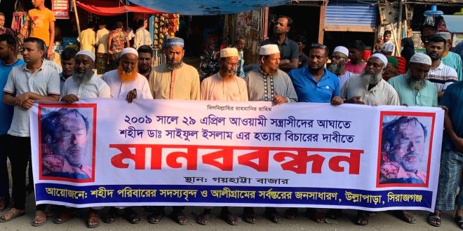 ডাঃ আমজাদ হোসেন উল্লাপাড়া প্রতিনিধিঃ সিরাজগঞ্জের উল্লাপাড়ায় রোববার (২৬ অক্টোবর) বিকেলে পল্লী চিকিৎসক ডা. সাইফুল ইসলাম হত্যার বিচারের দাবিতে মানববন্ধন হয়েছে। উপজেলার গয়হাট্টা বাজারে বিকেল তিনটায় সাইফুল ইসলামের পরিবারের সদস্যগণ ও আলীগ্রাম জনসাধারণের আয়োজনে মানববন্ধন হয়।এতে সাইফুল ইসলামের স্বজনেরা, নানা পেশার জনগণ উপস্থিত ছিলেন। মানববন্ধন অনুষ্ঠানে বক্তারা বলেন বিগত ২০০৯ সালের ২৯ এপ্রিল গভীর রাতে আওয়ামী সন্ত্রাসীদের হাতে পল্লী চিকিৎসক ডা. সাইফুল ইসলাম নৃশংসভাবে খুন হন পল্লী চিকিৎসক ডা. সাইফুল ইসলাম।  মানববন্ধনে বক্তাগণ সংশ্লিষ্ট কর্তৃপক্ষের কাছে তাকে (সাইফুল ইসলাম) হত্যার দ্রুত বিচার