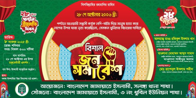 দিবসটি ঘরে গতকাল শনিবার বিকাল ০৩ টার সময় বাংলাদেশ জামায়াতে ইসলামী সলঙ্গা শাখার উদ্দ্যোগে ও ৩নং ধুবিল ইউনিয়ন শাখার সৌজন্য  সলঙ্গা ইসলামীয়া উচ্চ বিদ্যালয় মাঠ প্রাঙ্গণে অনুষ্ঠিত হয়। উক্ত অনুষ্ঠানে সলঙ্গা থানা শাখার আমীর রাশেদুল ইসলাম শহীদের সভাপতিত্বে প্রধান অতিথি হিসেবে বক্তব্য প্রধান রাখেন, সিরাজগঞ্জ- ৪ উল্লাপাড়া ও সলঙ্গা আসন থেকে জামায়াত মোনোনীত এমপি পদপার্থী, বাংলাদেশ ইসলামী ছাত্রশিবিরের সাবেক কেন্দ্রীয় সভাতি, সিন্টে সদস্য ও রাজশাহী বিশ্ববিদ্যালয়ের রুয়ার সভাপতি ও বাংলাদেশ জামায়াতে ইসলামীর   কেন্দ্রীয় সহকারী সেক্রেটারি জেনারেল আলহাজ্ব রফিকুল ইসলাম খান।