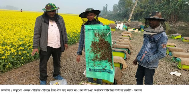 তাড়াশের সগুনা গ্রামের মাঠে ২০০ মৌবাক্স নিয়ে মধু সংগ্রহে এসেছেন সাতক্ষীরার শ্যাম নগর এলাকার বাসিন্দা মৌচাষি ইসমাইল হোসেন। তিনি জানান, পূর্ণ বা পরিণত মৌমাছির তাপমাত্রা সহ্য করার ক্ষমতা ১০ থেকে ৫০ ডিগ্রি ্রপর্যন্ত। আর অপরিণত মৌমাছির লার্ভা বা শূককীটের ঠান্ডা- শীত সহ্য ক্ষমতা একেবারে কম। শীতকালে কৌশলে মৌচাকের তাপমাত্র সহনীয় রাখে মৌমাছি। কিন্তু পৌষের চলমান এ সময়ে এর ব্যত্যয় ঘটছে। ফলে ঘন কুয়াসা, কনকনে শীত এবং উত্তরের হিমেল হাওয়ায় মৌচাকবা মৌবাক্সের ভেতরের তাপমাত্রা কমেছে। এ কারণে ঠান্ডায় মারা যাচ্ছে বিপুল সংখ্যক মৌমাছি। বিশেষ করে অপরিণত মৌমাছির লার্ভা বা শূককীটের ঠান্ডা-শীত সহ্য করতেনা পেরে নষ্ট হয়ে মৌমাছির বংশ বিস্তারে ছন্দপতন ঘটছে।বর্তমানে শুধু মাত্র চলনবিলে সিরাজগঞ্জের তাড়াশে এ অঞ্চলের ২২- ২৫ জন, নাটোরের গুরুদাসপুরে ৩৫- ৪০ জন, সিংড়ার ১৫- ২০ জনসহ নয়টি উপজেলার শতাধিক মৌচাষি মধু সংগ্রহ করছেন। এর সঙ্গে রয়েছে সাতক্ষীরা, বাগেরহাট, খুলনা, যশোর, কুষ্টিয়াসহ দক্ষিণ-পশ্চিমাঞ্চলের আরও ২০০- ২৫০ মৌচাষি।