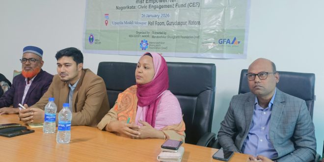 মানবাধিকার সংস্কৃতি ফাউন্ডেশনের সহযোগিতায় ও নিডা সোসাইটির বাস্তবায়নে গুরুদাসপুরে নাগরিকতা এমপাওয়ারহার প্রকল্পের কার্যক্রম হিসাবে উপজেলা জেন্ডার সমতা বিষয়ক অ্যাডভোকেসী সভা অনুষ্ঠিত হয়েছে। সোমবার বিকেলে উপজেলা মডেল মসজিদ মিলনায়তনে অনুষ্ঠিত সভায় প্রধান অতিথির বক্তব্য রাখেন উপজেলা নির্বাহী কর্মকর্তা ফাহমিদা আফরোজ। উপজেলা কমিটির সভাপতি রোকসানা আক্তার লিপির সভাপতিত্বে বিশেষ অতিথির বক্তব্য রাখেন উপজেলা কৃষি কর্মকর্তা কে.এম রাফিউল ইসলাম, সমাজসেবা কর্মকর্তা মো. শফিকুল ইসলাম ও চলনবিল প্রেসক্লাবের সভাপতি আলী আক্কাছ।