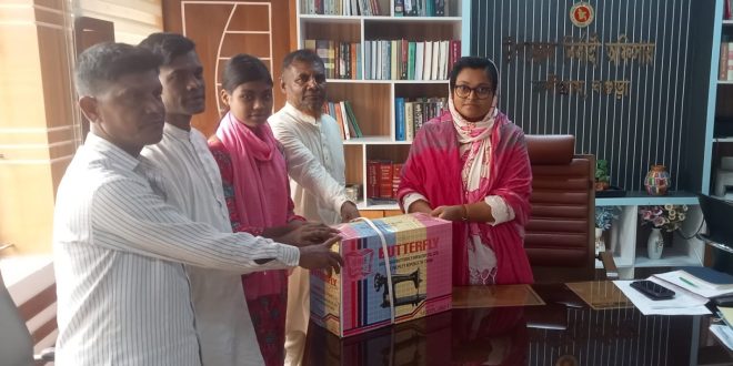 বগুড়ার নন্দীগ্রামে এক অসহায় পরিবারের সদস্যদের মাঝে সেলাই মেশিন প্রদান করা হয়েছে। ১১ই মার্চ (বুধবার) দুপুর ১২ টায় বগুড়া জেলা প্রশাসকের নির্দেশনায় নন্দীগ্রাম উপজেলা নির্বাহী অফিসার শারমিন আরার তত্ত্বাবধানে এবং ৪ নং থালতামাজগ্রাম ইউপি চেয়ারম্যান (প্যানেল-১) শামসুর রহমানের চেষ্টার প্রেক্ষিতে থালতামাঝগ্রাম ইউনিয়নের থালতা গ্রামের মিন্টু কুমার শীলের মেয়ে শ্রাবন্তী রানী শীল (১৭) কে একটি সেলাই মেশিন প্রদান করা হয়েছে। দীর্ঘদিন হলে উক্ত অসহায় পরিবারটি আয়-উপার্জনের অবলম্বন হিসেবে একটি সেলাই মেশিন দাবি করে আসছিল। তারই প্রেক্ষিতে আজ উক্ত পরিবারটিকে ডেকে উপজেলা নির্বাহী অফিসারের কার্যালয় হতে একটি সেলাই মেশিন প্রদান করা হয়।
