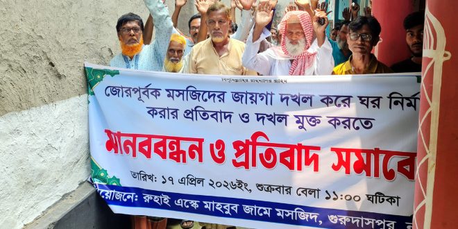 নাটোরের গুরুদাসপুরে মসজিদের জায়গা, সরকারি রাস্তা ও বসতবাড়ির জায়গা জবরদখলের অভিযোগ উঠেছে আইনজীবী আব্দুল মোতালেব আনাম ও তার মেয়ে শিউরী খাতুনের বিরুদ্ধে।শুক্রবার বেলা ১১টায় উপজেলার রুহাই গ্রামের চকপাড়ায় এস্কে মাহাবুব জামে মসজিদের সামনে অনুষ্ঠিত মানববন্ধনে ওই অভিযোগ করেন এলাকাবাসী। অবৈধ দখলের কারণে মসজিদের সামনের সরু রাস্তায় ঠাসাঠাসি ভাবেই মানববন্ধন করেন তারা।